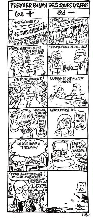 It is revealing that the cartoons, but not the comic strips or the prose articles, of Charlie Hebdo have been flying around the world and turning up in attempts to analyze the meanings of Charlie Hebdo and the work of its cartoonists. One explanation is, of course, the easy availability of cover illustrations, which are quickly scanned and uploaded to the web, where they can be consulted by virtually anyone with a computing device and a connection. Another is the fact that relatively few people bought Charlie Hebdo, with sales no doubt mainly limited to people within France. Luz bitterly and ironically alludes to the magazine’s recent financial problems in a strip, titled “Premier bilan des jours d’après” [First accounting of the days after] in the first post-attack issue of the magazine: on the positive side, he notes, Charlie Hebdo was given a huge financial subsidy after the tragedy, allowing it to print a record-breaking number of copies of this issue. In the facing, negative column, he draws bodies and blood on the floor after the merciless killings.